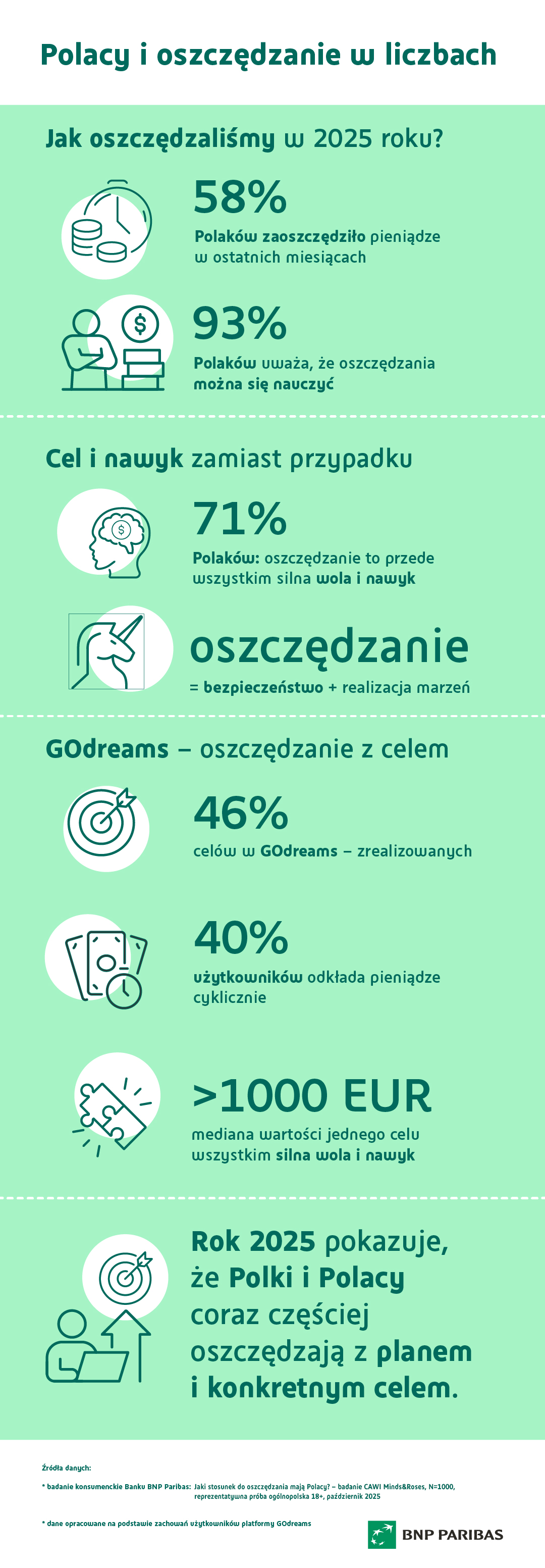 Zmianę tę potwierdzają także dane z usługi GOdreams, dostępnej w aplikacji Banku BNP Paribas, która pozwala odkładać pieniądze na konkretne cele. W 2025 roku 46% celów założonych w GOdreams zostało już zrealizowanych, co pokazuje, że oszczędzanie oparte na jasno zdefiniowanym marzeniu znacząco zwiększa skuteczność odkładania środków.