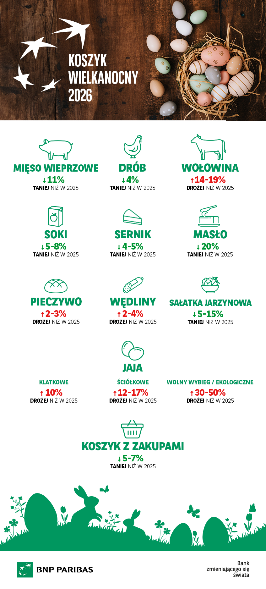 Jak co roku, eksperci Banku BNP Paribas trzymają rękę na pulsie domowych wydatków, by pomóc Klientom w spokojnym zaplanowaniu nadchodzących Świąt. Główny wniosek analityków, którzy prześwietlili rynkowe ceny, napawa optymizmem: koszyk produktów najczęściej kupowanych przed Wielkanocą będzie o około 5–7% tańszy niż w analogicznym okresie ubiegłego roku. Nie oznacza to jednak, że obniżki obejmą absolutnie wszystko.